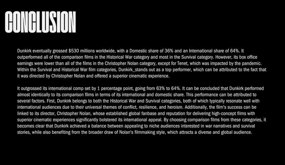 I conducted a comprehensive box office analysis of Dunkirk, comparing its performance to historical war films, survival stories, and Christopher Nolan’s filmography. Explored audience trends, international markets, and the impact of IMAX and ensemble casts on global box office success.