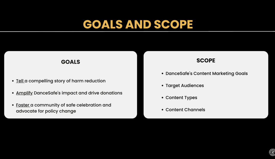 As part of a team project, I co-developed a comprehensive social media strategy for DanceSafe, a nonprofit focused on harm reduction in nightlife communities. Our playbook included audience research, content guidelines, and platform strategies to increase engagement and promote safe practices.
